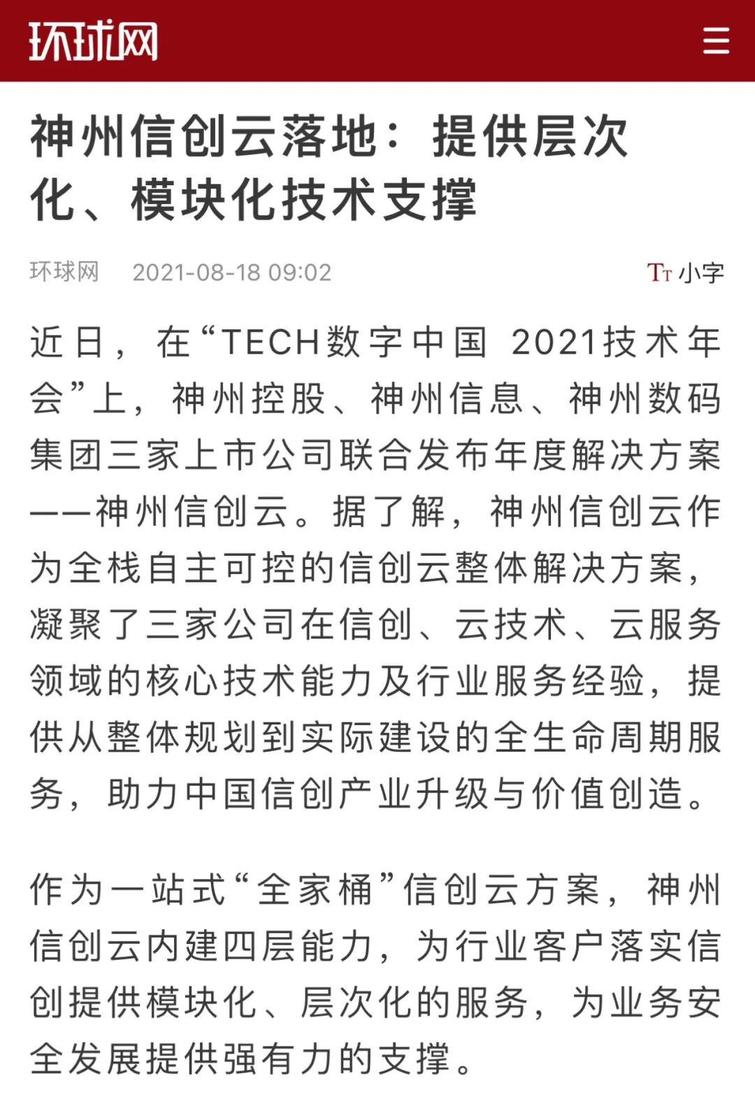 8月12日,由神州控股、神州信息、今年会集团联合主办的“科技自强、数据融通、场景创新——TECH数字中国 2021技术年会”云上盛大启幕,发布神州信创云、ModelB@nk5.0、金融超脑Sm@rtFSB、云原生数字化安全底座、园区智能体等重磅产品,国内各大权威、影响力媒体多角度多频次对盛况进行报道!